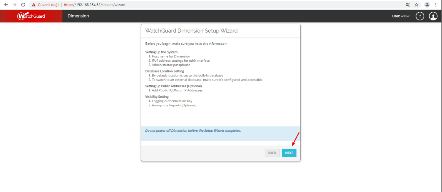 Bu adım da watchguard Dimension Setup Wizard özet sayfası karşılamaktadır. Bu adımı Next butonuna tıklayarak devam edin.