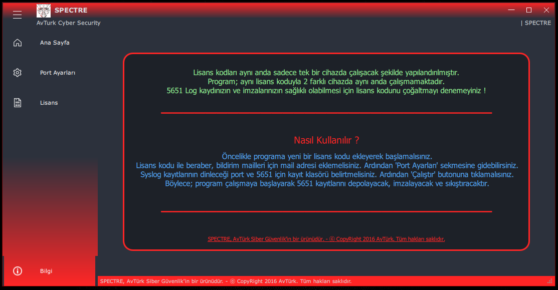 - Logların tutulduğu cihazın güvenliği, Spectre 5651 log programının açık tutulması ve sunucu olarak kullanılacak cihazın 7/24 aktif hizmet vermesi tamamen sizin sorumluluğunuzdadır. Avtürk Siber Güvenlik Yazılım Hiz. San. Dış. Tic. bu tür log kayıplarından sorumlu değildir.
